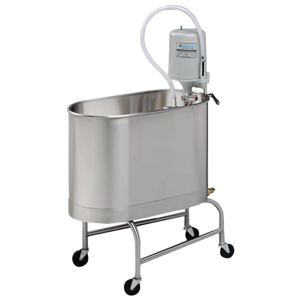 The 10 gallon mobile whirlpool with undercarriage of heavy duty construction and fixed height which raises the tank for use in treatment of the upper extremities.